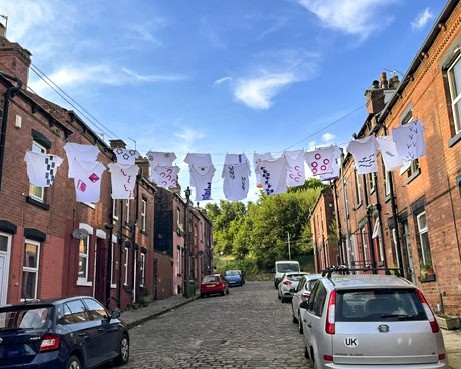Kirkstall Art Trail commissioned an artist to work with The Vicarage’s residents over the summer. The Vicarages are a number of back-to-back terrace houses with cobbled streets, with washing lines reaching across the street from house to house. The artist was briefed to collaborate with local residents to create a large scale work that would be displayed on their streets during the Art Trail.
