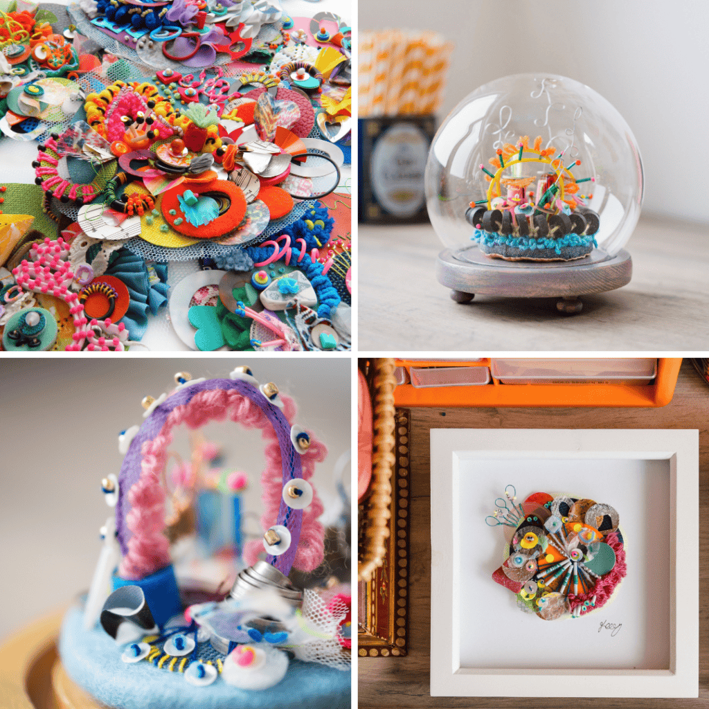 “I am an embroidery artist and workshop facilitator from West Yorkshire. I create vibrant hand-stitched sculptures, wall art, and installations. My artistic practice is playful and full of joy. I transform waste and discarded materials into embellished treasures. I then hand-stitch them onto fabric.”