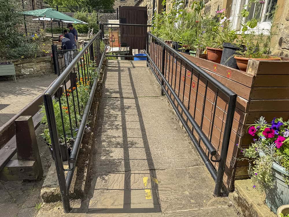 - There are hand railings on either side of the ramp.